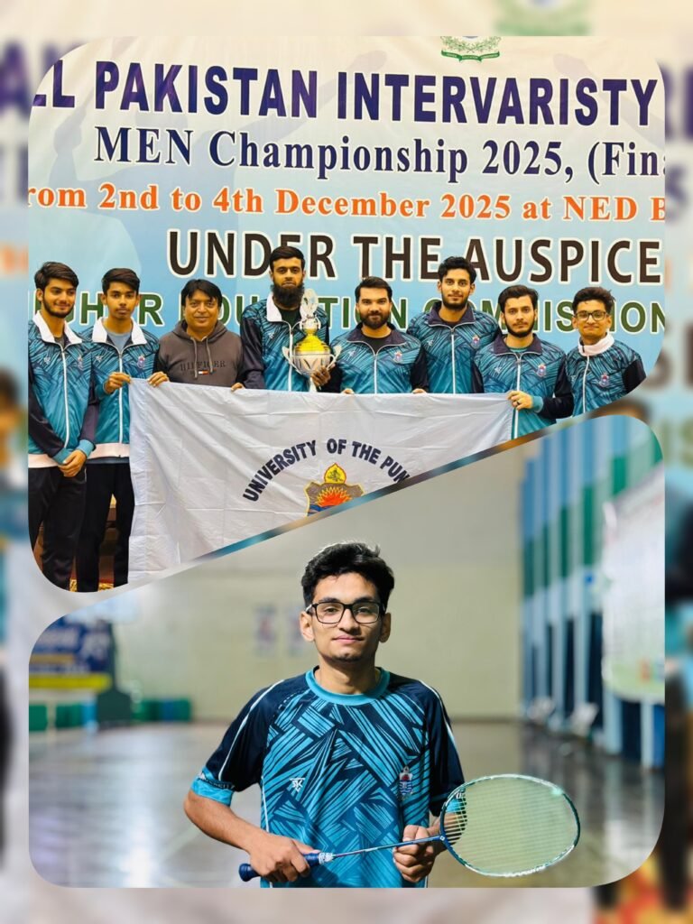 The Punjab University Badminton Menβs Team has secured 1st position π₯ in the Menβs Singles category and 3rd position π₯ overall in the All-Pakistan HEC Intervarsity Badminton Championship 2025β26, organized by NED University, Karachi.