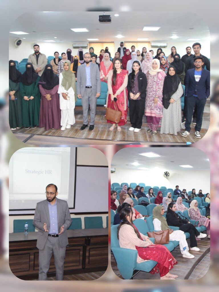 A Guest Speaker Session was conducted featuring *Mr. Farhan Shabbir*, Chief Innovation Officer at Innovation World, who delivered an insightful talk on “*Role of AI in HR and Market Trends*.” The session was organized by *Ms. Shiza Kazmi* (PhD Scholar, IAS & Lecturer, UMT) for the 7th Semester HR Specialization students on 21st November 2025, Friday at 9:00 AM. The students greatly benefited from valuable practical perspectives on AI-driven strategies, talent acquisition, and employee retention practices.