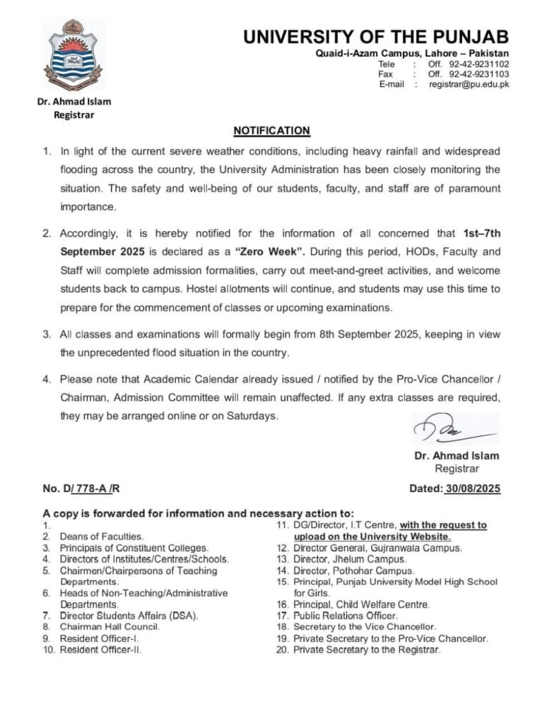 Classes of all Undergraduate & Postgraduate Programs/Semesters (Fall 2025) will commence from Monday 8th September 2025.Â